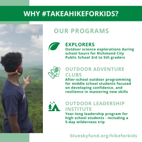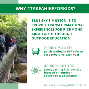 That’s why plan to #TakeAHikeForKids to support Blue Sky Fund, a local Richmond nonprofit that provides transformational experiences for youth through outdoor education.