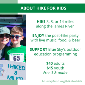 Blue Sky is on a mission to provide transformational experiences for Richmond area youth through outdoor education. Hike for Kids is our largest fundraising event supporting our programming. We invite our community from the Richmond metro area, along with Blue Sky Fund supporters across the country, to participate and fundraise for Blue Sky.